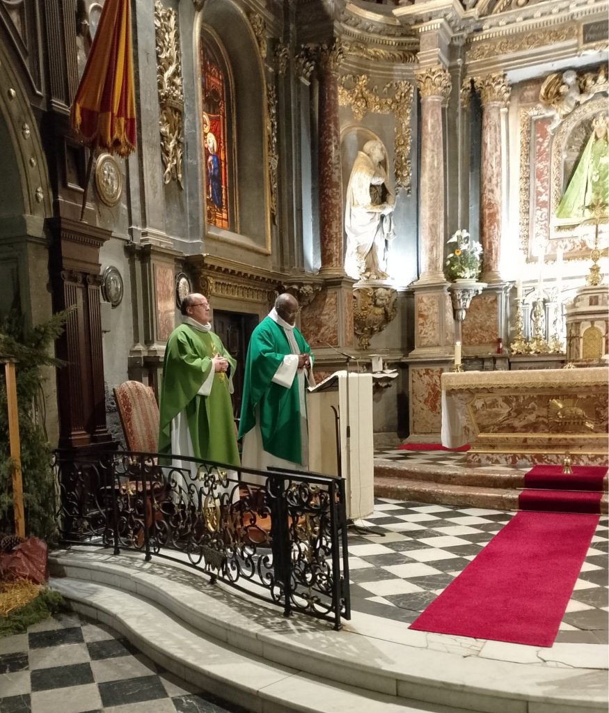 Joie de retrouver le Père Yves Maurice Zambo pour une Messe à la basilique, à l’occasion de son passage pour une réunion avec la confrérie Notre Dame Consolatrice et Immaculée.